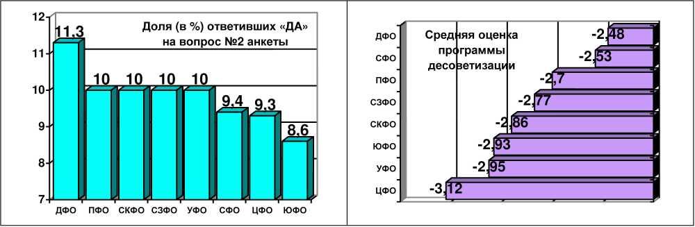 Отношение к программе десталинизации в зависимости от того, в каком Федеральном округе проживают респонденты (упорядочено по убыванию).