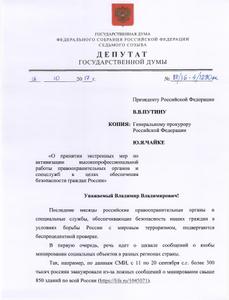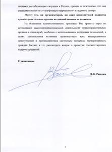 Рашкин обратился к президенту и генпрокурору с просьбой «принять меры по активизации высокопрофессиональной деятельности правоохранительных органов и спецслужб, особенно с использованием передовых технологий, в целях установления истинных организаторов всех вышеуказанных преступлений и противодействия системным попыткам терроризировать граждан России, в том числе рассмотреть вопрос о принятии соответствующих кадровых решений».