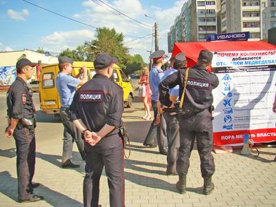 Но полицейские не вняли здравому предложению. Они вызвали подкрепление – еще две полицейские автомашины. Некоторые сотрудники правоохранительных органов прибыли даже с автоматами. После этого к коммунистам применили силу. Первым подхватили под мышки и забросили в полицейский автомобиль Первого секретаря Ивановского обкома КПРФ В.В. Клёнова. Такая же судьба ждала и других партийных товарищей: заломили руки секретарю Ивановского обкома КПРФ по организационно-партийной и протестной работе, уполномоченному представителю избирательного объединения А.Д. Бойкову, агитаторам КПРФ - матери и дочери В.А. Алексеевой и Л.В. Антошкиной. В это время прохожие открыто выражали свое возмущение грубыми действиями полиции, а временами и полубандитскими.