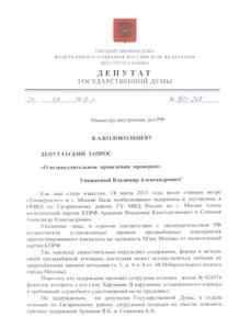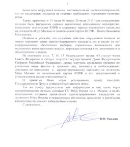 На основании ст.ст. 7, 14, 17 Федерального закона «О статусе члена Совета Федерации и статусе депутата Государственной Думы Федерального Собрания Российской Федерации», прошу поручить проведение проверки по указанным выше фактам и привлечь лиц, виновных в необоснованных действиях по отношении к зарегистрированному кандидату на должность Мэра Москвы от политической партии КПРФ и его представителей, к установленным видам ответственности.