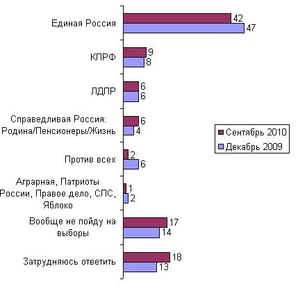 С каким соотношением партийно-политических сил выйдет страна из этих выборов, в канун их можно судить лишь по косвенным данным. Сугубо ориентировочное значение имеет, например, зондаж общественного мнения по вопросу о ближайших гипотетических выборов в Государственную Думу. Это демоскопическое исследование было осуществлено службой «Башкирова и партнеры» ( ) в сентябре, полученные в ходе его данные соотнесены с результатами предыдущего опроса, предпринятого в декабре прошлого года.