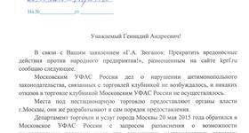25 июня лидер КПРФ выступил с обращением «Прекратить вредоносные действия против народного предприятия», которое было опубликовано на нашем сайте (). 26 июня в адрес Г.А. Зюганова поступил ответ из Управления Федеральной антимонопольной службы по городу Москве (см. иллюстрацию).