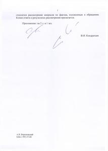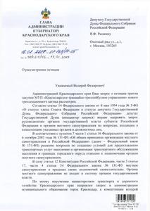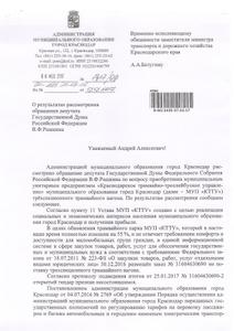 Депутату Госдумы В.Ф. Рашкину пришел ответ на его запрос от заместителя главы муниципального образования город Краснодар Е.В. Зименко.
