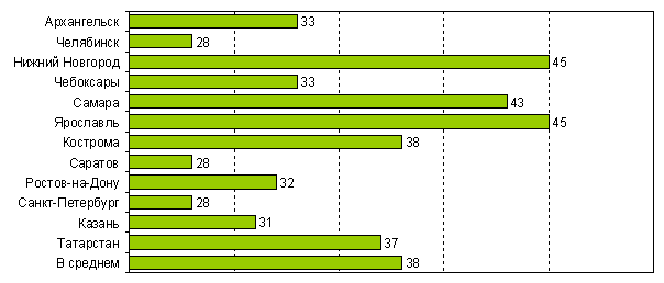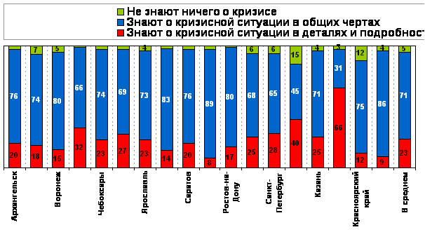 Наиболее информированными оказались жители Петербурга, Самары, Волгограда, Ярославля и Чебоксар (знают о ситуации в подробностях от 23% до 28%). Дальше всего от экономических проблем чувствуют себя жители Красноярского Края (11%), а также Костромы (14%) и Воронежа (15%).