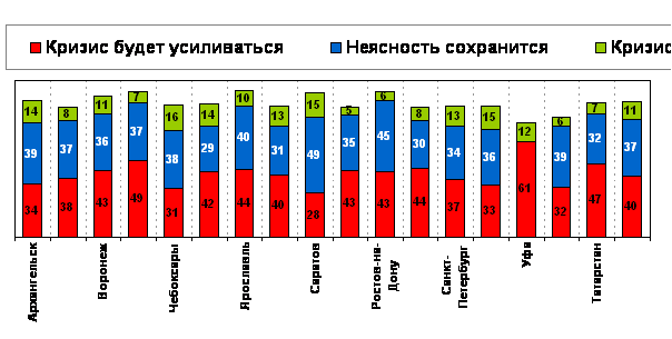 Неглубокое знание деталей и особенностей кризиса не мешает опрошенным прогнозировать его дальнейшее развитие. Так, воронежцы уверены в его углублении (43% при 38% в среднем по городам опроса). Наиболее неясным развитие кризиса представляется ростовчанам и саратовцам (45% и 49% соответственно). Саратовцы также оказались наиболее оптимистично настроенными относительно развития кризиса. Они и жители столицы Чувашии (15% и 16% соответственно) чаще других полагали во второй половине ноября, что кризис вскоре закончится. В среднем же по массиву доля людей, считающих, что кризис будет ослабляться, составляет лишь 11%.