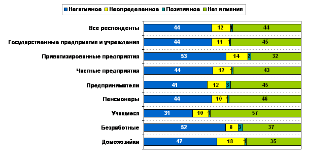 Наиболее остро воспринимают влияние кризиса безработные (52% в этой группе указали, что кризис негативно влияет на их уровень жизни). Вероятно, именно «благодаря» кризису эти люди либо попали в группу безработных, либо опасаются еще дольше оставаться в ней. От их оценок практически не отличаются оценки занятых на приватизированных предприятиях, т.е. таких, которые когда-то были государственными, а сейчас либо полностью, либо частично стали частными (53%). Слабее всего влияние кризиса оценивают учащиеся (57%), что, скорее всего, объясняется их низкой включенностью в экономические отношения (особенно это характерно для студентов младших курсов).