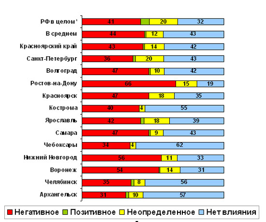 Около 44% опрошенных заявили, что кризис уже оказал негативное влияние на их уровень жизни. Доля респондентов, считающих, что кризис не сказывается на уровне жизни, имеет почти ту же величину, 43%. Однако если ситуация будет развиваться в соответствии с представлениями опрошенных, эта величина должна заметно увеличиться. Около 60% респондентов, опрошенных в регионах, полагают, что развитие кризиса рано или поздно приведет к ухудшению их материального положения. Среди лидеров в таких оценках – Челябинск (72%), Ростов-на-Дону (70%) и Нижний Новгород (66%). Наименее пессимистичными являются северные Петербург (45%) и Архангельск (56%).