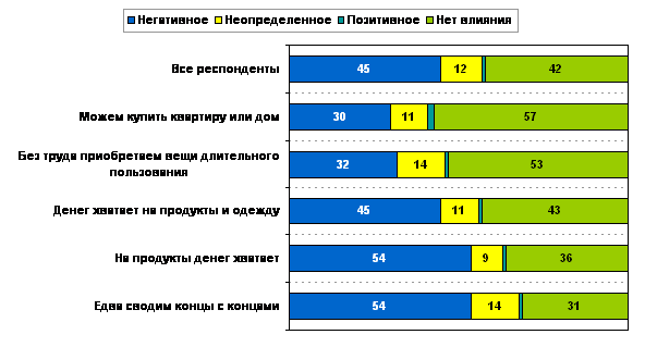 Наиболее чувствительный удар кризис нанес по тем, кто «едва сводит концы с концами» и тем, у кого «денег хватает только на питание» (по 54% респондентов в этих группах указали, что кризис негативно влияет на их уровень жизни). Напротив, те, кто «может без труда приобретать товары длительного пользования» или вовсе «все, включая квартиру или дом» пока не почувствовали влияния кризиса (больше половины респондентов в этих группах указали, что кризис не имеет влияния на уровень жизни). Сходные тенденции обнаруживаются и при обработке ответов представителей разных доходных групп на вопрос о перспективах развития кризиса – бедные полагают, что станут еще беднее, а богатые надеются, что кризис их не затронет.