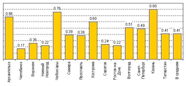 Ниже всего этот индекс в Челябинске, Ростове, Н.Новгороде и Саратове (0.17-0.24). Выше всего – в Чебоксарах, Архангельске и Костроме (0.60-0.78). Однако, ни в одном из городов индекс не приближается к единице, т.е. доля оптимистов не превышает долю пессимистов (данные приведены на рис. 1).