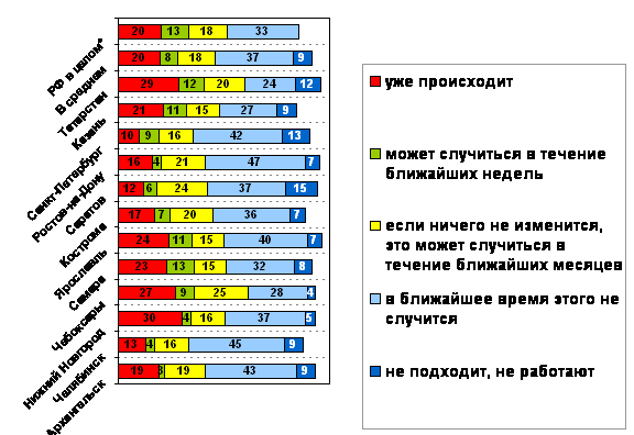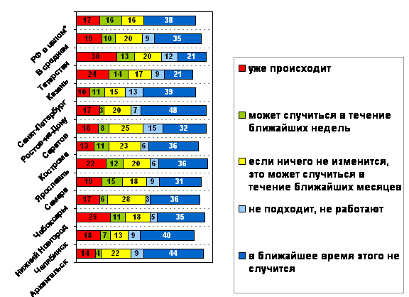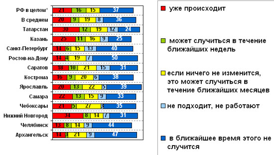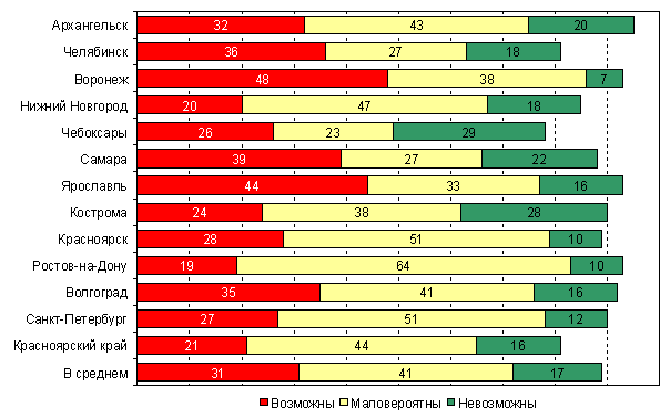 В среднем по городам исследования около трети (31%) считают массовые выступления против падения уровня жизни вполне вероятными. В период кризиса 1998 года о вероятности таких выступлений по данным Левада–центра говорили 48% россиян, а после начала действия закона о монетизации льгот, когда выступления были реальными, – 36%.