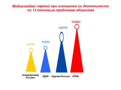 Заметно, что Компартия активно вытесняет ЛДПР и «СР» из той сферы медийного поля, где отражаются наиболее болевые для общества проблемы. Здесь КПРФ создавала больше инфоповодов, комментарии экспертов-коммунистов по волнующим общество проблемам оказались более востребованы СМИ.