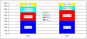 Что касается соответствия риторики партий общественному запросу, то пока лидерство «ЕР» сохраняется, но оно уже не столь бесспорно. Доля «ЕР» в общем объеме информсообщениях по ключевым вопросам национальной повестки дня немного упала – 41% в 2019 г. против 42% в 2016 г.Доля упоминаний КПРФ в публикациях по актуальным для населения проблемам выросла до 35,1% (рост на 7%). А вот ЛДПР не совсем «попадала» в «яблочко» доминирующих народных запросов: доля партии Жириновского упала с 18% до 10%. У «Справедливой России» также падение доли в атуальном событийном инфополе - с 13% до 11%.