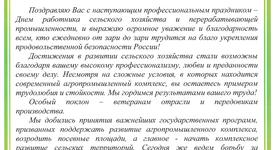 Поздравляю Вас с наступающим профессиональным праздником – Днем работника сельского хозяйства и перерабатывающей промышленности, и выражаю огромное уважение и благодарность всем, кто ежедневно от зари до зари трудится на благо укрепления продовольственной безопасности России!