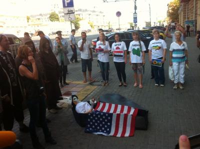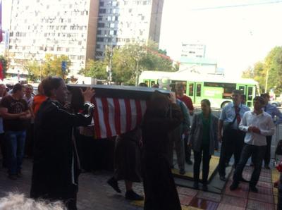 В завершение акции комсомольцы разыграли театрализованное представление, символизирующее похороны американской демократии.