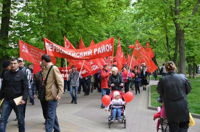 К 11 часам площадь перед театром заполнили коммунисты, комсомольцы, представители Союза офицеров иДетей войны. Две тысячи красных праздничных шаров с эмблемой КПРФ, собранных в пышные букеты украсили место проведения митинга. Ребята – участники традиционной первомайской эстафеты – с большим удовольствием разбирали коммунистические шарики.