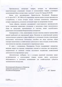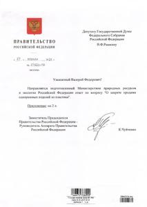 В поступившем из правительства ответе сообщается: «Минприроды России поддерживает инициативу введения запрета на продажу одноразовых изделий из пластика, как инструмент, направленный на снижение степени негативного воздействия хозяйственной деятельности на окружающую среду».