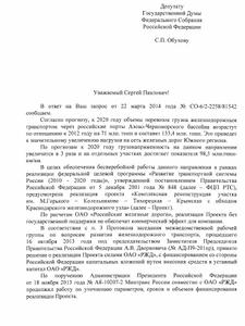 - Недавно я получил на свой депутатский запрос ответ от заместителя Председателя Правительства РФ А.В. Дворковича. К своему письму он приложил подробную информацию о реализации проекта «Краснодарский проект», подготовленную министром транспорта М.Ю. Соколовым.