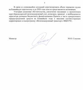 Министр мне сообщил длительную историю этого проекта. Тут кстати всплыла информация, что для решения транспортных проблем юга России правительство РФ еще в 2001 году приняло постановление о реализации проекта «Комплексная реконструкция участка им. М. Горького – Котельниково – Тихорецкая – Крымская с обходом Краснодарского железнодорожного узла».