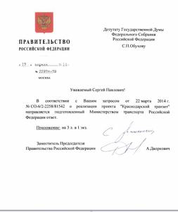 После двух взаимопротиворечащих ответов, которые С.П.Обухов получил из Правительства и РЖД, по поводу реализации проекта «Краснодарский транзит» депутату вновь пришлось тормошить кабинет министров. На днях за подписью вице-премьера А.Дворковича С.П.Обухов получил скорректированный ответ правительства, который дезавуировал ранее «отстраненную» позицию РЖД.