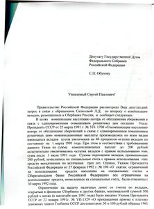 Первый заместитель Председателя Правительства РФ И. Шувалов ответил на запрос депутата Госдумы С. П.Обухова по вопросу о вкладах граждан, помещенных в Сбербанке России до 20 июня 1991 года.