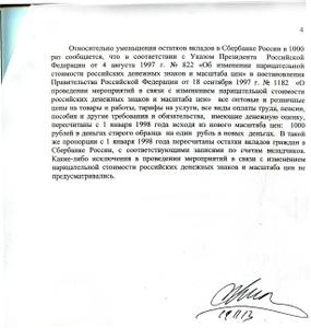 Относительно уменьшения остатков вкладов в Сбербанке России в 1000 раз сообщается, что в соответствии с Указом Президента Российской Федерации от 4 августа 1997 г. № 822 «Об изменении нарицательной стоимости российских денежных знаков и масштаба цен» и постановления Правительства Российской Федерации от 18 сентября 1997 г. № 1182 «О проведении мероприятий в связи с изменением нарицательной стоимости российских денежных знаков и масштаба цен» все оптовые и розничные цены на товары и работы, тарифы на услуги, все виды оплаты труда, пенсии, пособия и другие требования и обязательства, имеющие денежную оценку, пересчитаны с 1 января 1998 года исходя из нового масштаба цен: 1000 рублей в деньгах старого образца на один рубль в новых деньгах.