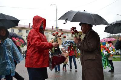Несмотря на дождливую и ветреную погоду, благодарные потомки победным строем, с развернутыми знаменами прошли через весь Парк Победы, попутно поздравляя ветеранов.
