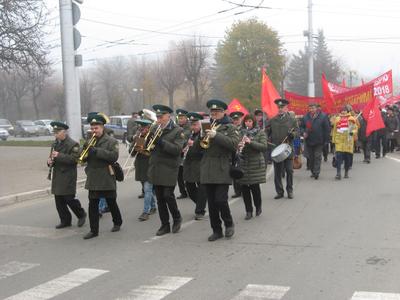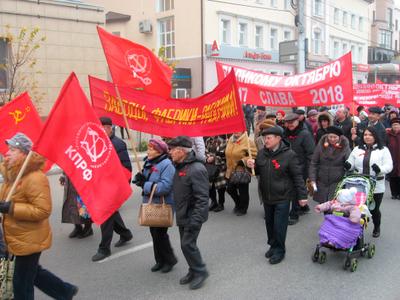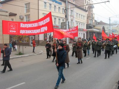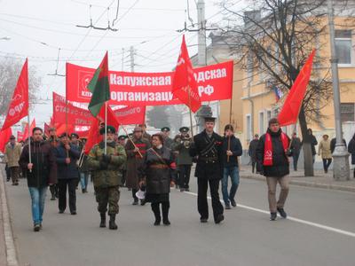 Коммунисты с алыми стягами и знаменами под военные марши духового оркестра проследовали колонной от площади Победы до памятника Владимиру Ильичу Ленину. Участники шествия дружно пели советские песни, поздравляли калужан с праздником Великого Октября.