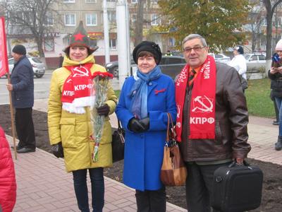 Митинг открыла и вела первый секретарь Калужского горкома КПРФ, депутат Законодательного Собрания Калужской области Марина Костина. Она поздравила участников митинга со 101-й годовщиной Великого Октября: