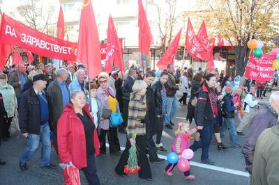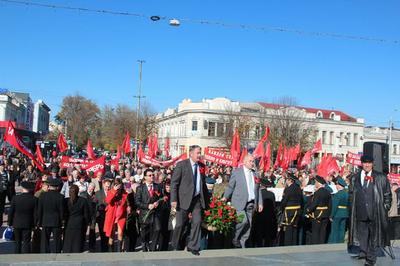 В центре города звучали знакомые всем революционные и патриотические мелодии. Одна за другой, с флагами и под звуки оркестра, на площадь им.В.И.Ленина прибывали колонны демонстрантов из разных районов Крыма. Сотни жителей собрались на центральной площади города Симферополя, чтобы отметить настоящую «красную» дату календаря и вспомнить события 1917 года.