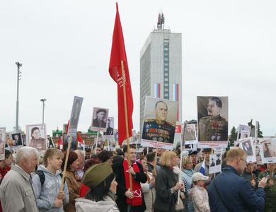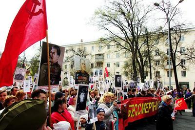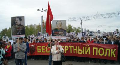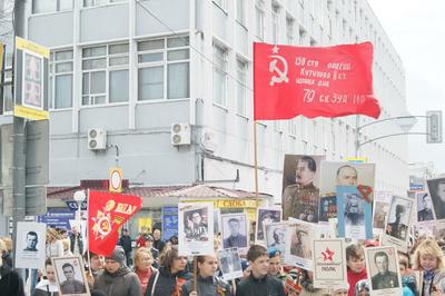 В колонну «Бессмертный полк» члены КПРФ встали с портретами И.В. Сталина и Г.К. Жукова, а также с копией Знамени Победы, которая была ими изготовлена еще в 2006 году и с тех пор выносится на все торжественные мероприятия. И сегодня, в день 70-летия Великой Победы, это знамя пронесли во главе колонны «Бессмертный полк» от площади 30-летия Победы до площади 100-летия со дня рождения Ленина.