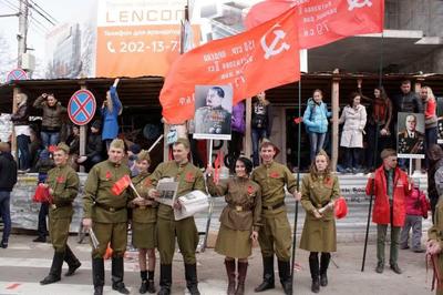 Молодёжь с флагами СССР и Знамёнами Победы раздавала всем, прежде всего, ветеранам и детям флажки «СССР», «Знамя Победы», специальный выпуск газеты «Правда» 1945 года,а также плакаты и коллажи с портретами И.В. Сталина.