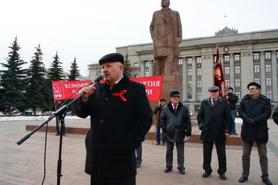 "97 лет Великой Октябрьской Социалистической революции неразрывно связано с именем В.И. Ленина. Когда наши политики уже больше 20 лет кормят народ пустыми разговорами, хочется у них спросить, может быть, кто-то из вас придумал и воплотил в жизнь лучшие лозунги, чем те, что были у Ленина, которые на заре советской власти овладевали массами и вели их на великие свершения? Сегодня нет ничего хотя бы отдаленно напоминающего те лозунги, под которыми восстанавливалась страна в ленинскую эпоху: "Хлеб - голодным!", "Мир - народам!", "Заводы - рабочим!", "Земля - крестьянам!", "Власть - советам!". Мог ли тогда кто-нибудь лучше и более точно отразить интересы и настроения граждан? ХХ век - это век Ленина и Сталина, век высокого патриотизма и удивительного героизма наших предшественников и огромной любви к советской Родине, к социалистическому Государству, рожденному Великим Октябрем и мы обязаны хранить это наследство", – сказал секретарь по протестному движению Кировского обкома КПРФ Владимир Иванович Осетров, открывая митинг.