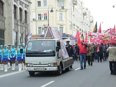 Во Владивостоке первомайские торжества открыли коммунисты. В 10:00 здесь началась демонстрация, организованная городским комитетом КПРФ. Заметим, официальное празднество, которое формировалось по разнарядке, началось на час позже и прошло по другому маршруту — по мосту через бухту Золотой Рог.