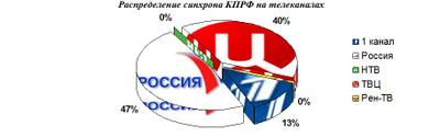 Наибольшую долю синхрона Коммунистам выделили «Россия» и ТВЦ (17 и 13%). Рен-ТВ не предоставил Компартии времени для прямой речи.