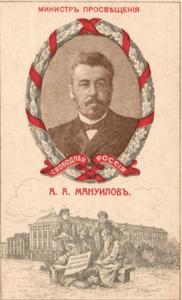 Министр народного образования Мануйлов отменил как меру наказания исключение учащихся гимназий и реальных училищ без права поступления в какие-либо учебные заведения.