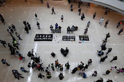 Антиправительственный протест в одном из торговых центров Гонконга. В прошлом году в Гонконге прошли массовые демонстрации против законопроекта о выдаче подозреваемых Китаю, политики правительства и вмешательства Пекина в дела Гонконга.