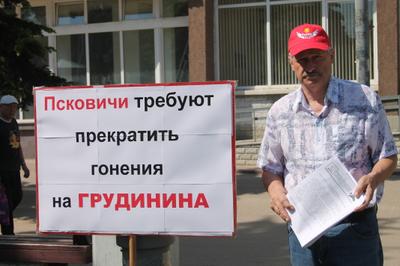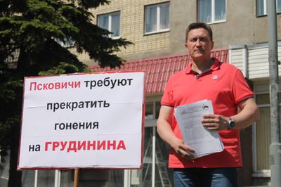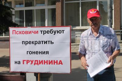 Секретарь Псковского горкома КПРФ Сергей Богданов несколько часов стоял с транспарантом на Рижском проспекте. Затем его сменил член ЦК КПРФ, первый секретарь Псковского обкома КПРФ Пётр Алексеенко. Плакат «Псковичи требуют прекратить гонения на Грудинина» привлекал внимание прохожих, которым пикетчики раздавали листовки с обращением Псковского областного отделения КПРФ «Руки прочь от Грудинина».