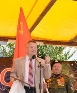 Ярким было выступление депутата ГД ФС РФ В.С.Никитина. От имени председателя ЦК КПРФ Г.А.Зюганова, фракции коммунистов в Госдуме и от себя лично он поздравил жителей и гостей Идрицы с праздником. Он отметил, что именно на священной Идрицкой земле родилось знамя Победы, именно на идрицкой земле созрела инициатива автопробега Всероссийского значения со Знаменем Победы по всей нашей стране. Эта акция не позволила кощунства над знаменем, которое предлагал совершить предатель-антисоветчик, в прошлом генерал Советской Армии и депутат в ГД от Единой России, - принять Закон о снятии со Знамени Победы наши священные символы Серп и Молот. Владимир Степанович отметил, что мы должны сохранить историю такую какую она есть – от ведической, Киевской до Императорской Руси и Советского периода.