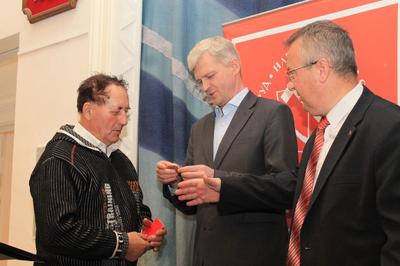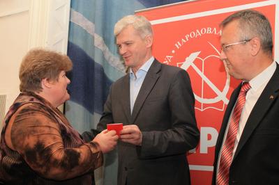 Депутат Государственной думы Игорь Ревин и член ЦК КПРФ, первый секретарь Псковского обкома КПРФ Александр Рогов торжественно вручили награды ЦК КПРФ передовым коммунистам, а также партийные билеты.