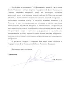 «Прошу Вас рассмотреть настоящий депутатский запрос и организовать проверку действий Д.К. Киселева», — говорится в документе. В запросе отмечается, что депутат попросил начать проверку о нарушении закона о противодействии экстремизму.