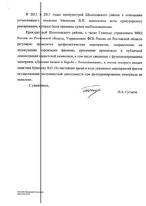 В 2009 году прокуратура Шолоховского района области требовала снести подобный памятник в станице Еланской, однако суд отказал, объяснив решение тем, что монумент «передает обобщенный образ донского атамана», а не конкретно Краснова.