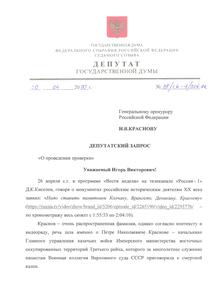 Депутат Госдумы от КПРФ Валерий Рашкин направил запрос генпрокурору Игорю Краснову после выпуска программы «Вести недели», где телеведущий Дмитрий Киселев заявил о необходимости «ставить памятники Колчаку, Врангелю, Деникину, Краснову». Депутатский запрос есть в распоряжении РБК.