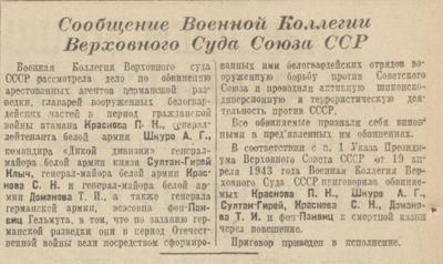 В 1945 году казаки, выступавшие на стороне нацистов, сдались в плен англичанам. Среди сдавшихся в плен был и Краснов. Англичане передали казаков СССР, а в 1947 году Краснова казнили по решению Военной коллегии Верховного суда Советского Союза. По мнению коллегии, он вел борьбу против СССР с помощью белогвардейских отрядов, а также проводил шпионско-диверсионную и террористическую деятельность против страны.