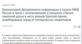 Издание опубликовало заметку о "МИД рассказал о краже в Польше памятной доски в честь советских воинов".