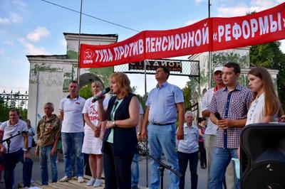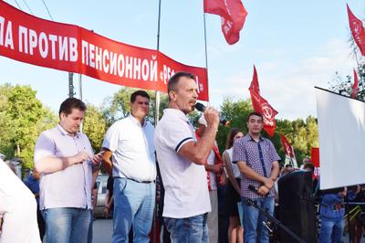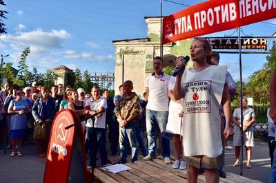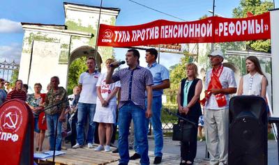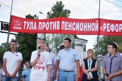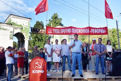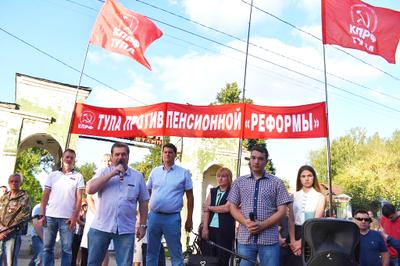 На митинге против повышения пенсионного возраста, организованном Тульским обкомом КПРФ, выступили председатель Независимого облсофпрофа Тульской области, рабочая завода РТИ, депутат-коммунист, секретарь Тульского обкома КПРФ Татьяна Косарева, заместитель председателя областной думы, депутат-коммунист Алексей Лебедев, депутат 2,3,4,5 созывов областной думы Владислав Сухорученков, рабочие тульских заводов, депутаты-коммунисты, экологические активисты, неравнодушные горожане. Митинг вёл секретарь обкома, заместитель председателя молодежного парламента области Михаил Фёдоров. С одобрением была встречена демонстрация видео выступления Г.А. Зюганова на всероссийской акции протеста в Москве 28 июля.