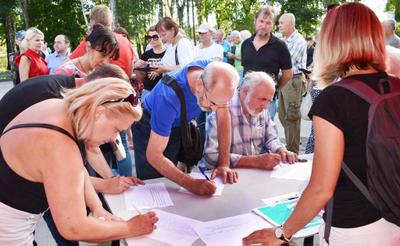 Во время митинга проводился сбор подписей против изменения пенсионного возраста. Люди стояли в очередях, чтобы поставить подпись.