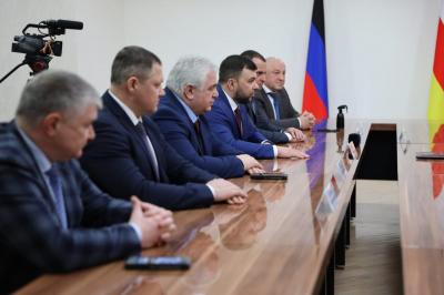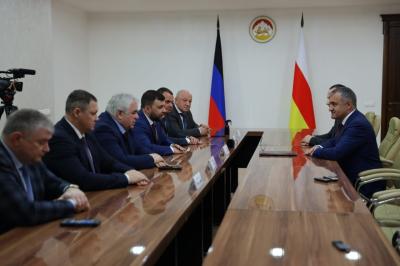Далее Казбек Тайсаев посетил Республику Южная Осетия. В рамках визита по пути в Цхинвал состоялось возложение цветов к мемориалу жертв Бесланской трагедии. После – вместе с Главой Донецкой Народной Республики Денисом Владимировичем Пушилиным и делегацией ДНР Казбек Куцукович Тайсаев провёл встречу с Президентом Южной Осетии Анатолием Ильичом Бибиловым.