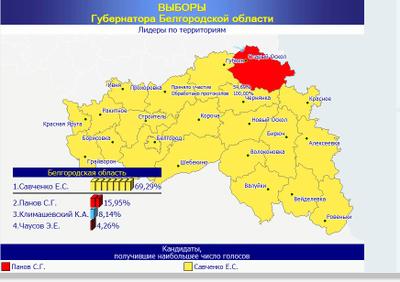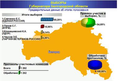 Общие итоги голосования на выборах губернатора Белгородской области: 69,3% - представитель «Единой Росси» уже седьмой срок подряд Евгений Савченко; 15,95% – представитель КПРФ Станислав Панов; 8,14% - представитель ЛДПР Константин Климашевский; 4,3% - представитель «Партии ветеранов» Эдуард Чаусов. При этом, явка на выборах оказалась низкой относительно прошлых: 52,5%.