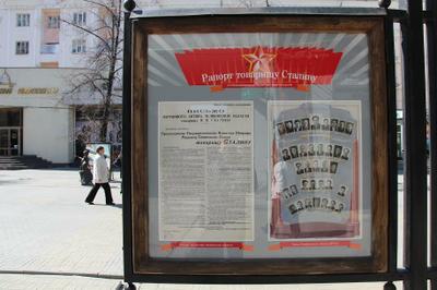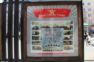 Сегодня, 28 апреля, на улице Кирова – центральной улице Челябинска - была торжественно открыта выставка «Рапорт товарищу Сталину от большевиков Челябинской области». На 12 стендах представлены самые интересные страницы из исторического документа весом в 30 кг. Каждый стенд – это история одного завода в годы Великой Отечественной войны: ЧЭМК, ЧТЗ, Станкомаш, цинковый и лакокрасочный заводы и других.