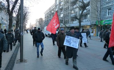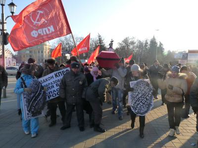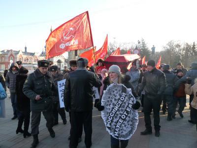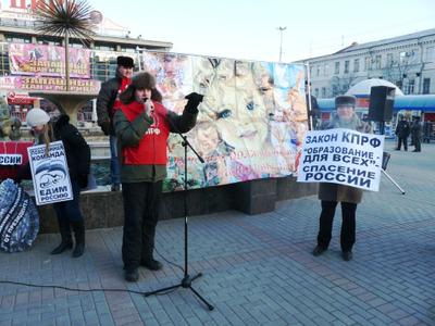 На площади у Крытого рынка – конечного пункта следования колонны и места проведения общегородского митинга протеста, несмотря на сильный мороз, собрались горожане с активной жизненной позицией. Над участниками митинга развевались флаги с символикой КПРФ. Участники акции выражали свой гневный протест против развала национальной системы образования.